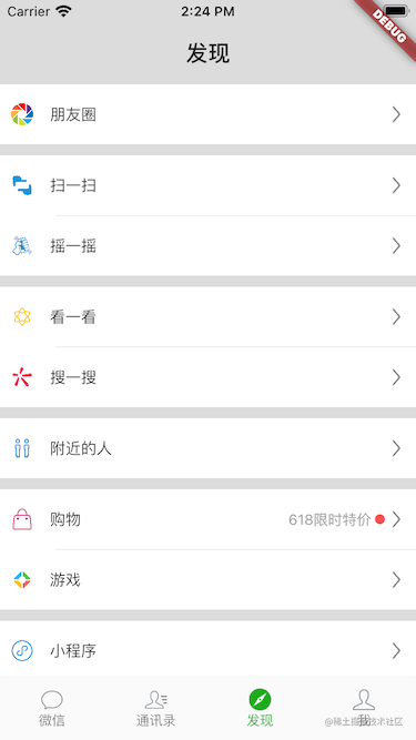 右侧由于子标题和子图标都不一定存在,所以需要做一些处理,Text 控件如果没有子标题可以显示空字符串‘’,这个比较好解决。而子图标不能说给一张空图片,所以需要根据 subImageName 是否为空来显示不同的控件,如果有就显示 Image,如果没有就显示一个 Container 占位。最右侧的箭头图标是每个 cell 都存在的就没啥好说的了。自定义 discover_cell 的代码就算完成了,下一步完善我们的发现页面