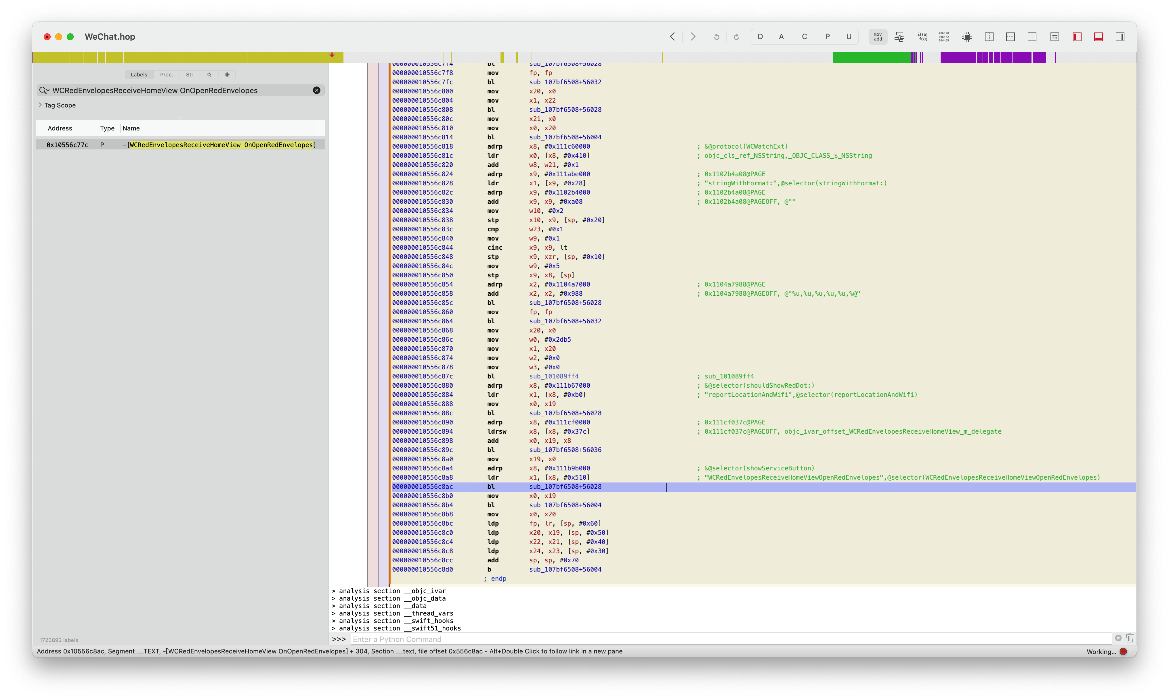 通过对寄存器的读取,我们得知此时,调用了 -[WCRedEnvelopesReceiveControlLogic WCRedEnvelopesReceiveHomeViewOpenRedEnvelopes] 方法。终于来到了真正开红包的地方了!以及红包相关的逻辑处理的类 WCRedEnvelopesReceiveControlLogic。
