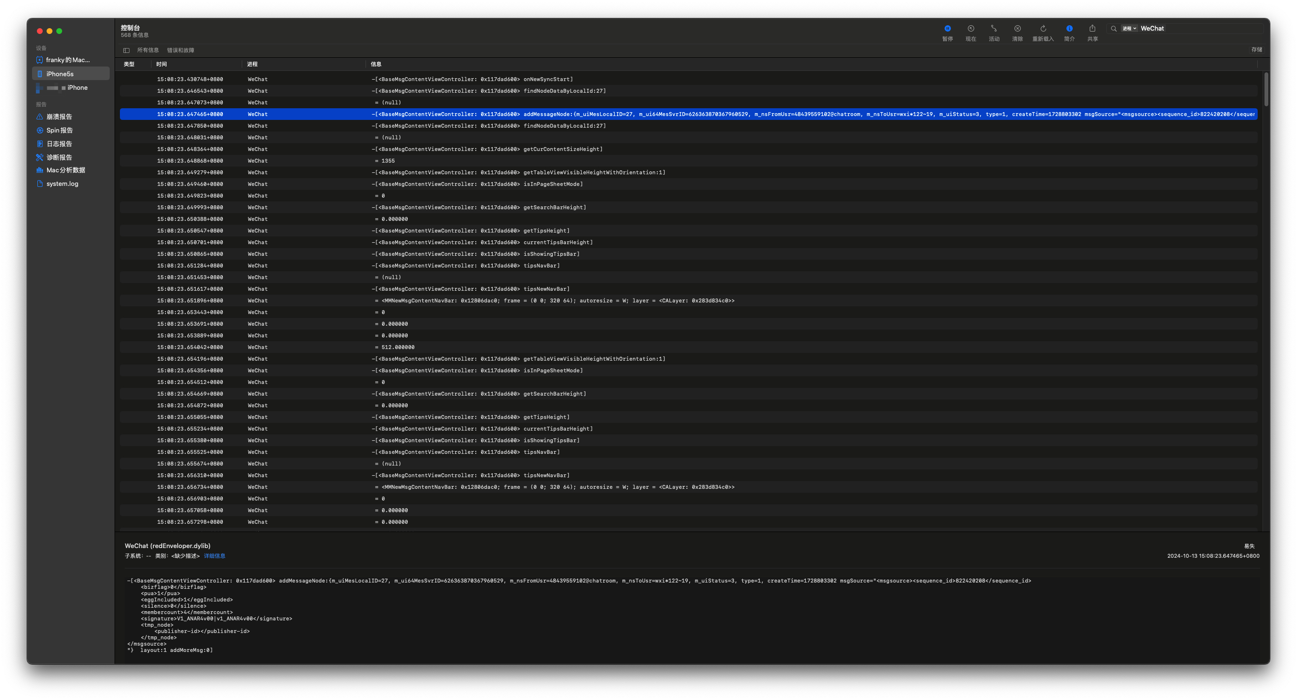 再次make package就可以成功编译了。之后make install安装到越狱设备上。我们在微信的聊天页面等待接收消息,然后打开 Mac 的控制台程序,选择我们的越狱设备,右侧搜索框输入 WeChat 过滤其他不关心的打印信息。接下来就可以给我们的越狱设备发生微信消息了,查看控制器台的打印信息,可以发现每次收到新消息的时候,都会调用以下这些方法,而高亮选中的方法带有一个 addMessageNode: 参数令人感到兴奋。