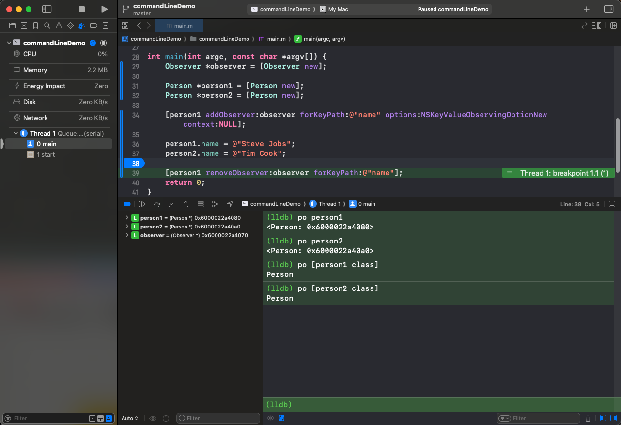 Cocoa Bindings: KVO 是 Cocoa Bindings 技术的基石。Bindings 是一种只存在于 macOS 上的技术并没有推广到 iOS 上,它允许在 Interface Builder 或代码中直接将 View 的属性(如 NSTextField 的 value)绑定到 Model 的属性(如 Person 对象的 name)。这种绑定的动态更新能力完全依赖于 KVO 在底层自动监测 Model 属性的变化并通知 View。