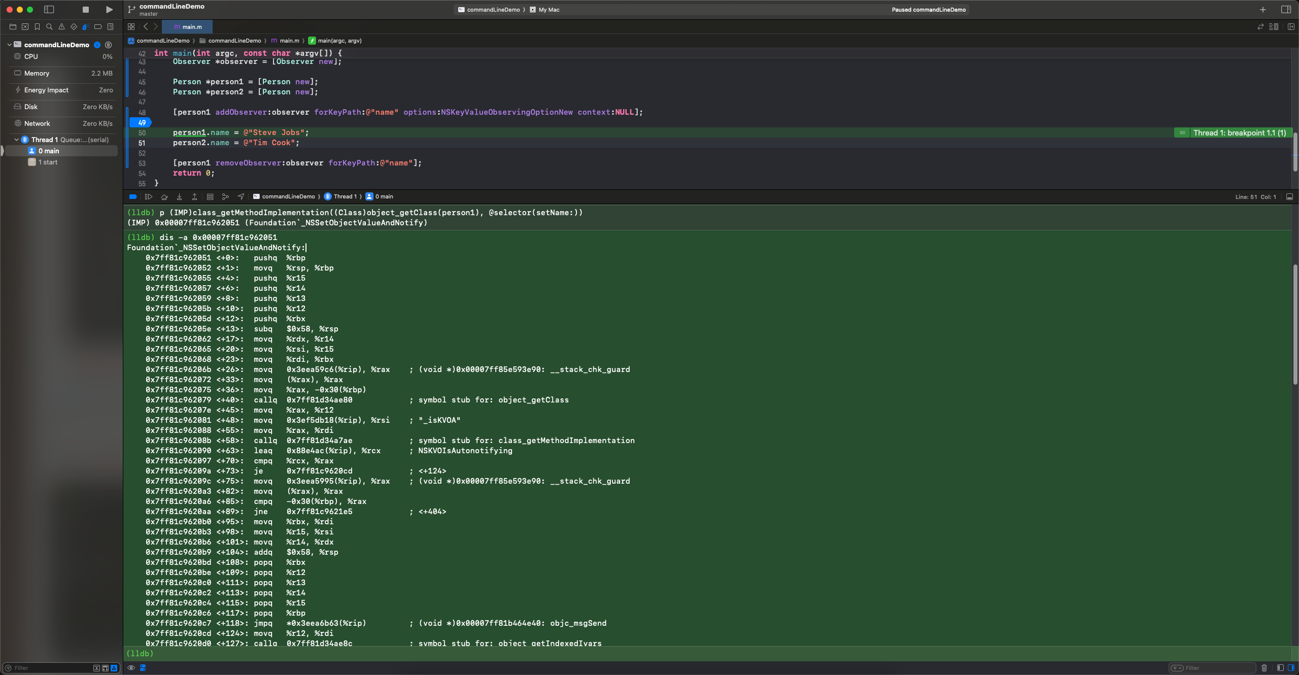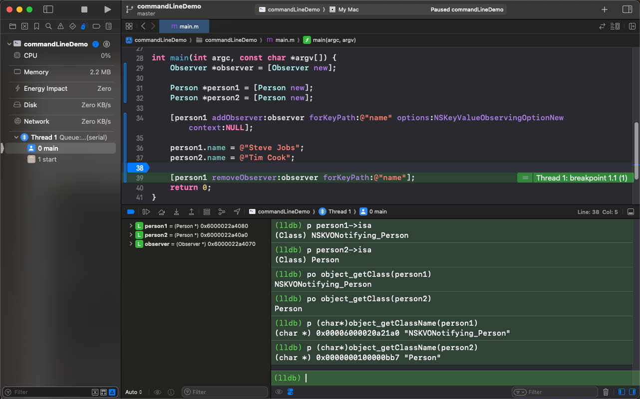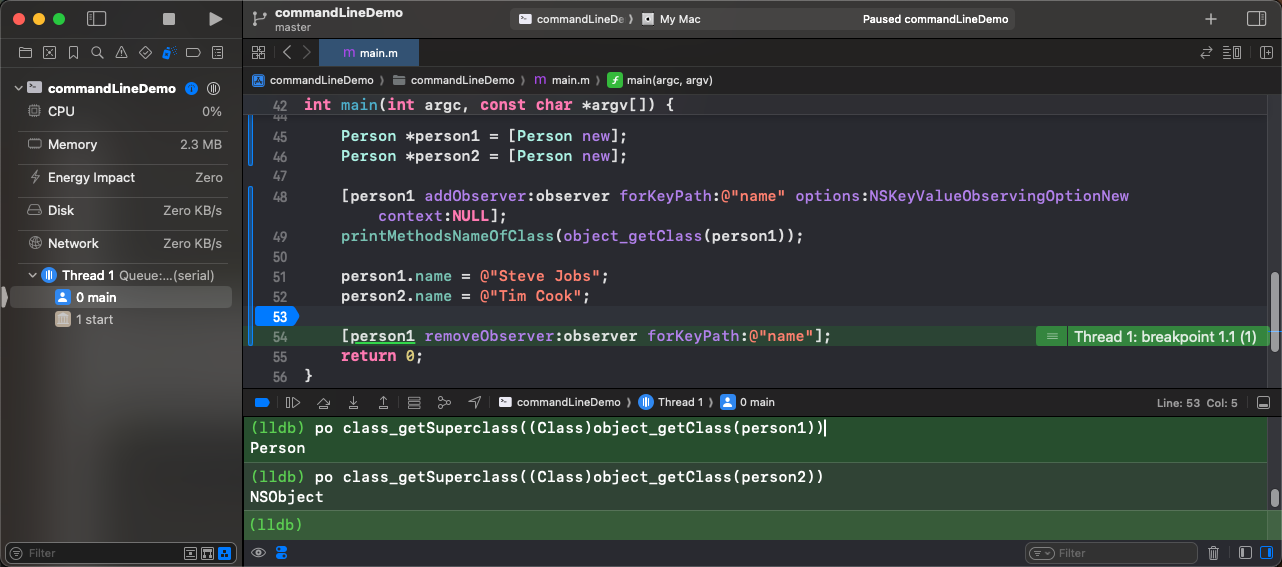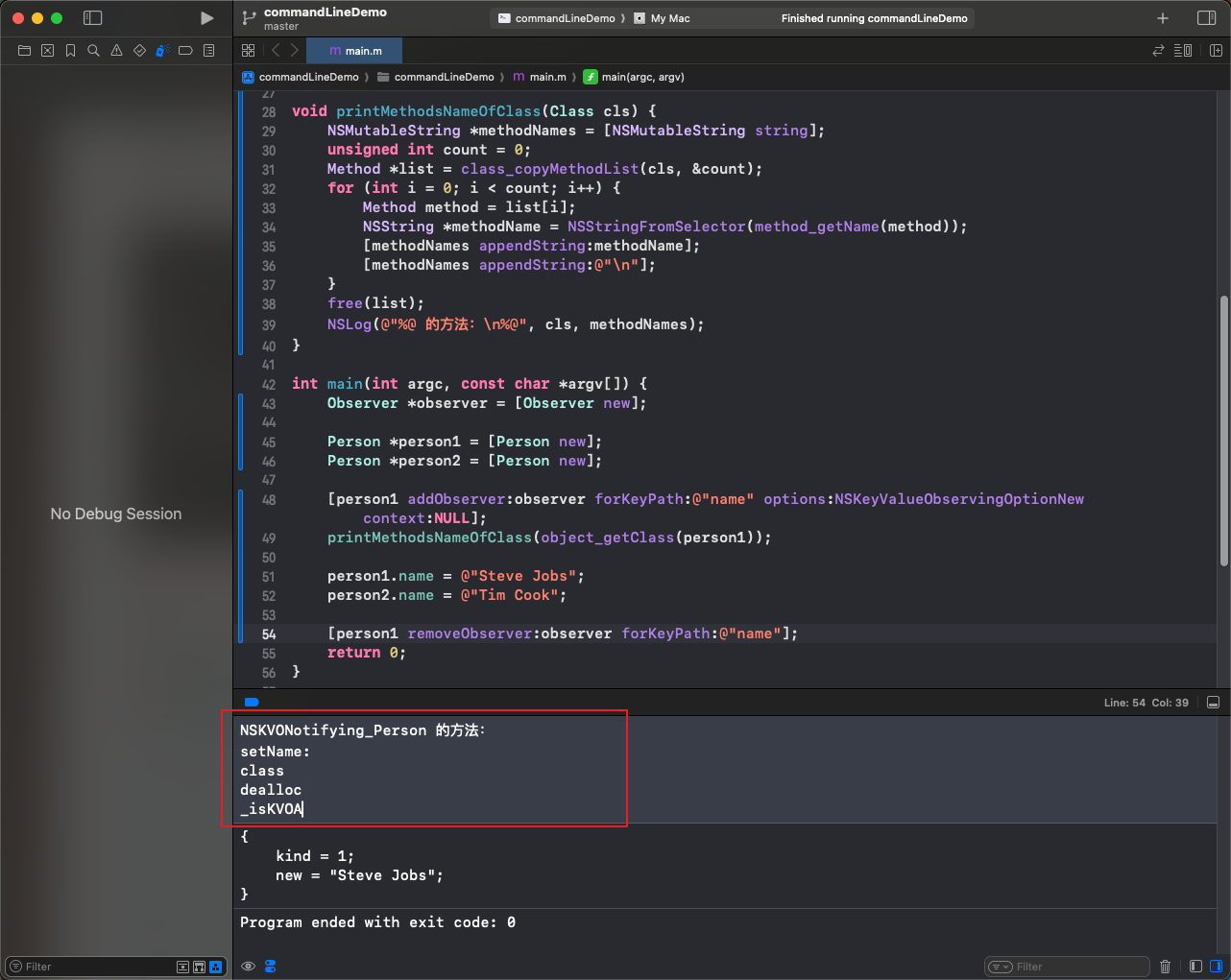 到这里算是实现最基本的 KVO 功能,可以测试一下能否实现最基本的键值观察。不出意外是能正常实现监听功能的。但此时代码中还是存在很多明显问题的。一是无法添加多个观察者,二是在控制器中使用时,会发现控制器无法释放了(这个问题其实是循环引用了)。代码如下: